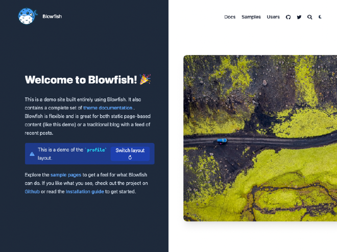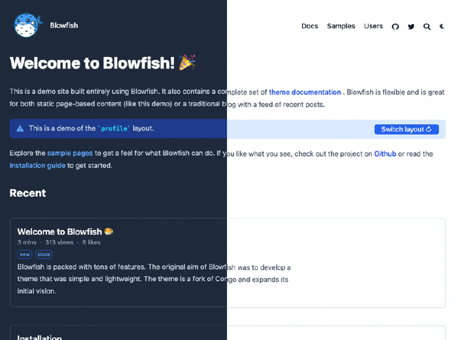 Blowfish provides a fully flexible homepage layout. There are two main templates to choose from with additional settings to adjust the design. Alternatively, you can also provide your own template and have complete control over the homepage content.