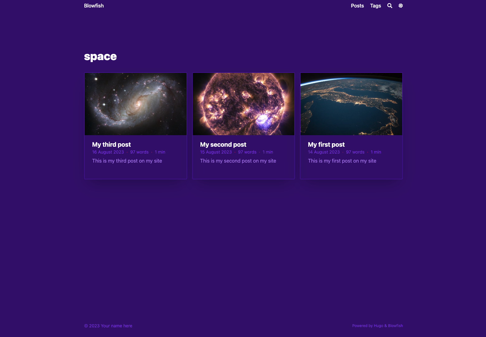 Now you have your first version of your homepage. You can make changes locally and once you commit your code they will automatically be reflected online. What shall you do next? I’ll leave you with some useful links to get you inspired and learn more about Blowfish and Hugo.